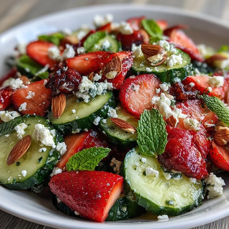 Pin it With minimal prep and a refreshing blend of textures, this salad is your go-to for a healthy boost during warmer months. The mix of sweet strawberries with the cool crunch of cucumber, complemented by aromatic mint, makes each bite vibrant and satisfying.