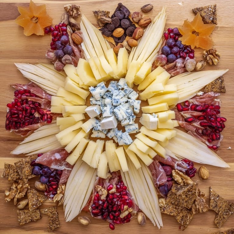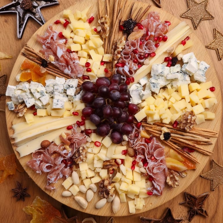 Pin it A festive and dazzling Christmas charcuterie board featuring a selection of artisan cheeses, cured meats, fresh fruits, nuts, and sweet treats, arranged in a starburst pattern to delight guests at any holiday gathering.