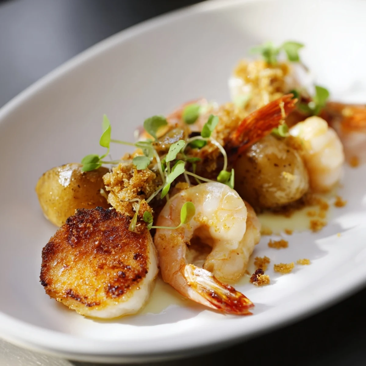 - Arrange potatoes, roasted vegetables, filets, scallops, shrimp, and smoked salmon elegantly on a large platter. Drizzle with the sauce, top with microgreens, and, if desired, apply flakes of edible gold leaf for a luxurious finish.